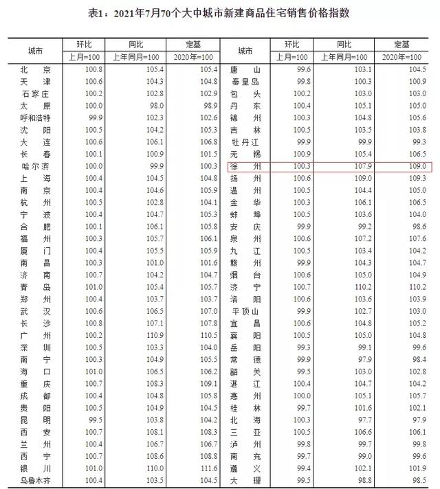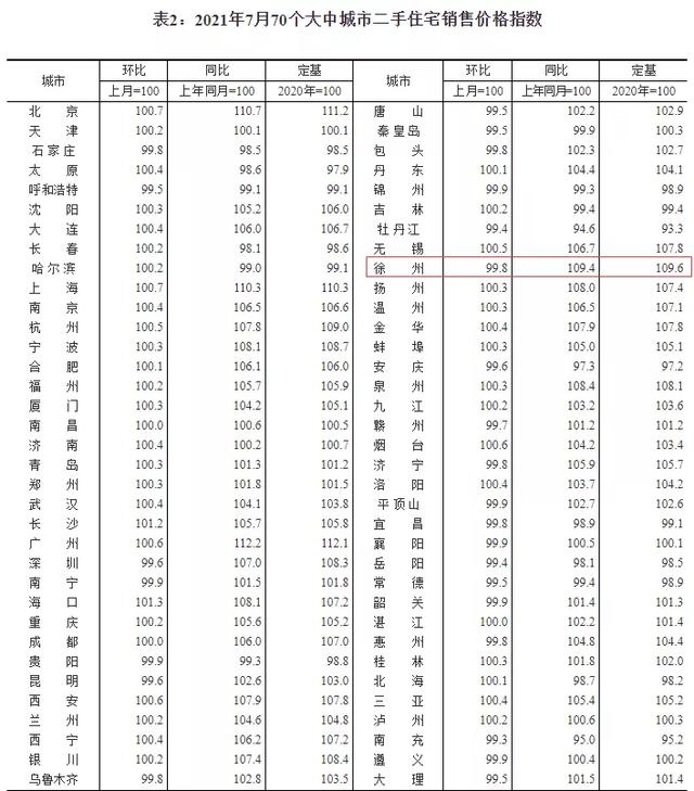 8月16日上午,国家统计局发布《2021年7月份70个大中城市商品住宅销售价格变动情况》,数据显示,徐州新建商品住宅价格普遍上涨,而与之对应的二手房价格略有下跌。