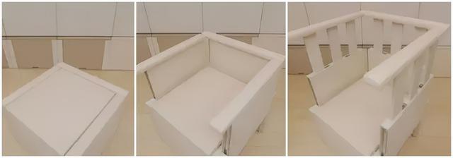一段是储物箱,二段是沙发靠背,三段是护栏,几个二段拼在一起,就是沙发。本间贵史对其制作要求极高:要结实耐用平稳抽拉平稳,不能露金属伤小孩……导致5家家具店无法做,差点就无法面世。