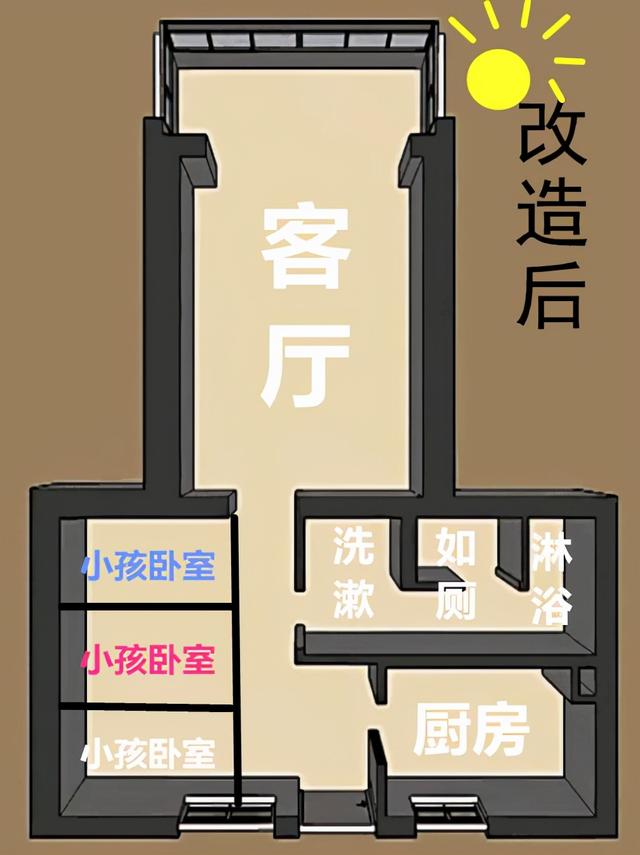 虽然客厅和卧室可以调节,但整个房子的布局并没有太大的变化(除了卫生间扩大)。由于本间贵史发现,孩子们平时都在带阳台且朝南的卧室活动。于是,朝南的那个带阳台的房间,变成了起居室。