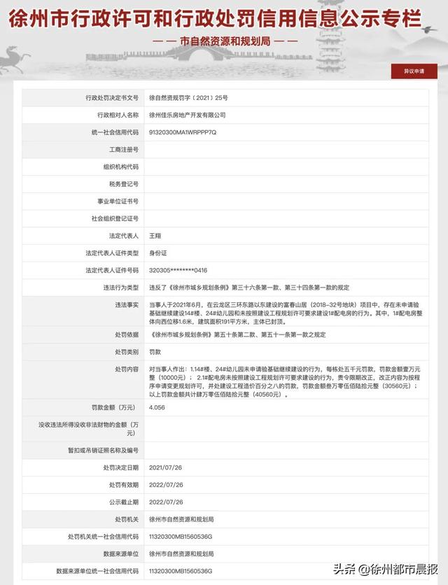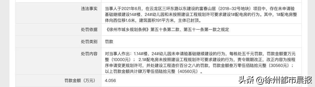 富春山居开发商徐州佳乐房地产开发有限公司因多项违规施工行为被罚款4.056万元。