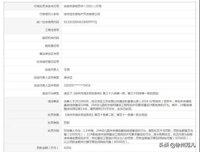 近期 ,市自然资源和规划局开出罚单,富春山居开发商徐州佳乐房地产开发有限公司在开发位于云龙区三环东路以东的富春山居(2018-32号)项目因违反《徐州市城乡规划条例》第三十六条第一款、第三十四条第一款的规定,未申请验基础继续建设、未按照建设工程规划许可要求建设被处罚4.056万元。