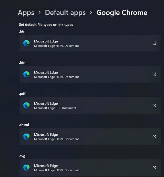 微软修改了Windows 11 中默认应用程序的设置方式,用户现在必须按照文件和链接类型设置默认应用程序。就拿Chrome浏览器来说,修改默认应用程序,用户需要同时修改HTM、HTML、PDF、SHTML、SVG、WEBP、XHT、XHTML、FTP、HTTP和HTTPS的默认文件类型。对于电脑小白来说,这无疑是一个大灾难。