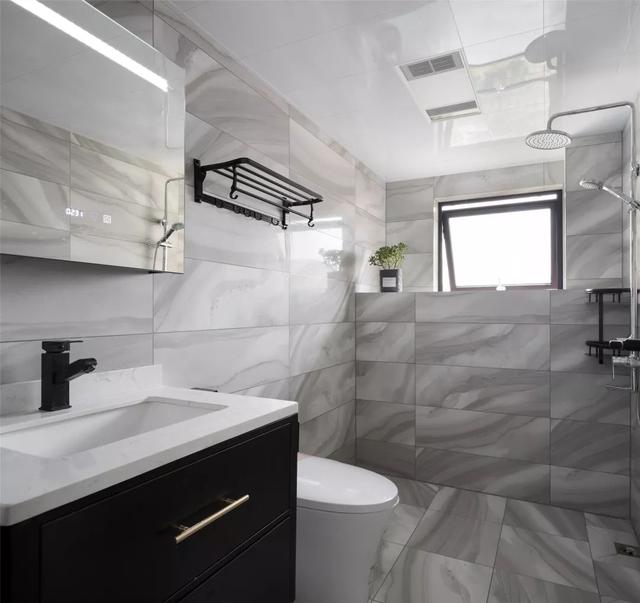灰白色的卫生间墙面砖,配以黑色的洗手盆柜子,让空间更加雅致端庄。