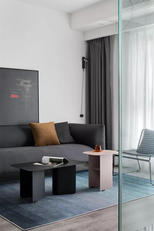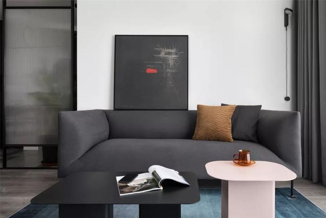 深灰布艺沙发+粉黑配黑茶几,摆在素蓝色的地毯上,整体空间轻柔、简约而大气。