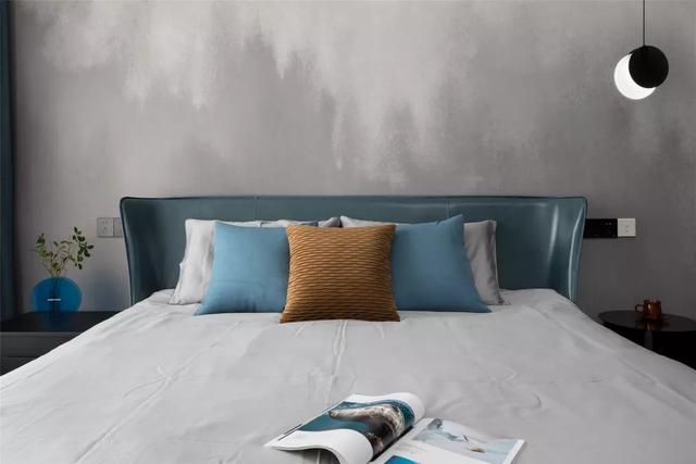 图为居室整体简洁的灰色空间,蓝色床单,搭配蓝色皮靠背床和窗帘,灰色和蓝色空间搭配,显得优雅端庄好惬意。