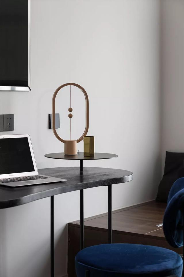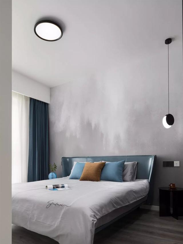 昏暗的床头背景墙,右侧的黑色和白色吊灯搭配,就像日月升降的轮回,让空间看起来时尚自然。