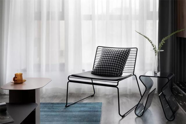 窗前摆放着一套黑色铁艺架休闲椅,配有亚克力小茶几,午后时间坐在这里读书,日子过得也是轻松舒适。