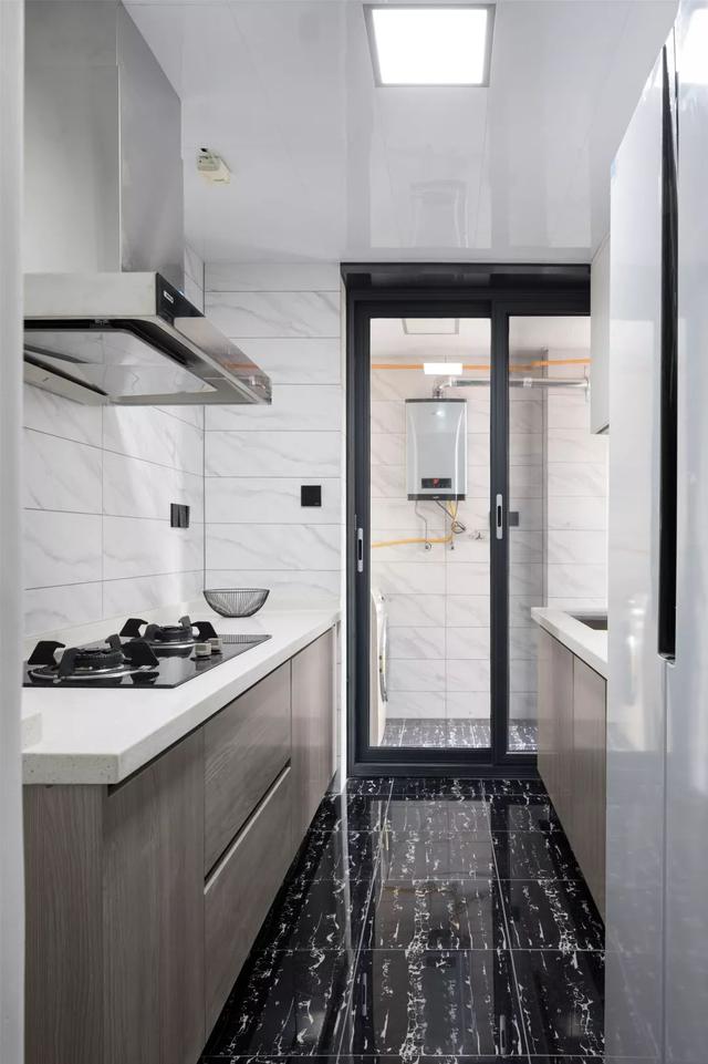 黑地砖+雅白墙砖,二字型的厨房格局,小巧的空间也为主人提供一种悠闲轻松的烹饪体验。