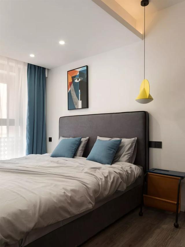 珍珠白的墙面基底,配以灰色的靠背床,挂上抽象的画作,黄色的吊灯,整个空间显得简约而又自然。