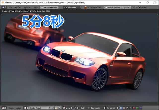 ▲Blender 2.79b,BMW渲染测试,5分8秒,第一梯队成绩!