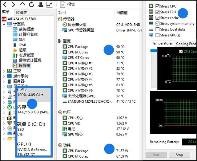 ▲答案是:处理器单负载考机,i5 11400H可稳定在70W~71.6W,频率达到全核4.05GHz——坦率说,考机时频率能够上4GHz的笔记本,极少见!另外,处理器的温度表现也比8核的R7 5800H好不少,不同核心的温度也就是在71℃~90℃范围波动,比R7000P的R7 5800H温度要明显低一些。