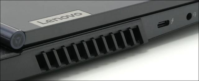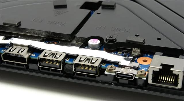 该机的屏幕前置,转轴在C面上考前,散热槽区域和接口部分后置——这种设计有个直观的好处就是:C面用户手能摸到的地方,都不太热。而大部分接口都设置在机身后部中间。