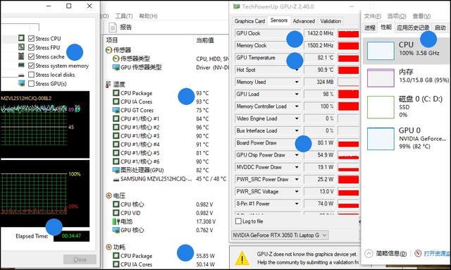 ▲该机的双考功率和R7000P极为接近,还略好一点点,尤其是配件内部温度方面要好不少。室温26℃,双考初期,处理器可保持60W,但随着时间推移,最终稳定在55W~56W,全核频率3.58GHz,此时处理器不同核心的温度在83℃~99℃波动(R7000P双考,处理器可达102℃,虽然外壳一点不烫,但还是有些“唬人”)。而3050Ti独显功率在80W~81.5W波动,频率1140MHz左右,30分钟后的稳定温度是82℃,Hot Spot热点温度为91℃。