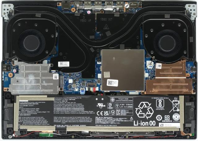 ▲Y7000P的内部图。注意左侧的银色散热片下的M.2插槽是空闲的,预装的SSD在右侧黄色散热片下。另外银色金属罩内是2根DDR43200 8GB内存。