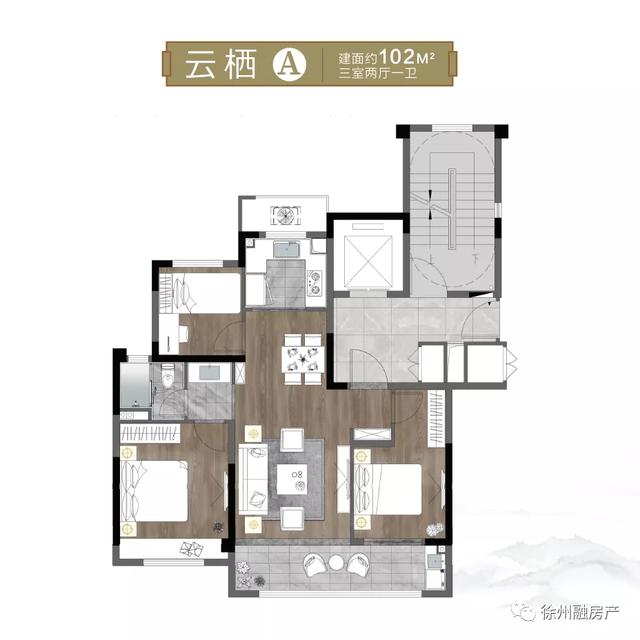 102户型,户型方正,没有冗余的走道,每一寸空间都得到了充分利用,大大提高了使用面积。