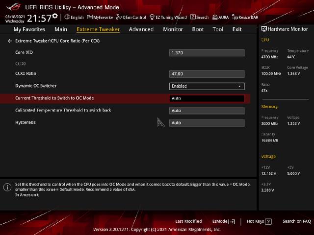 最后,我们进入ROG C8E的BIOS中,开启PBO和Dynamic OC Switcher混合双模超频功能,并在后者的选项菜单中设置好全核超频频率和电压。