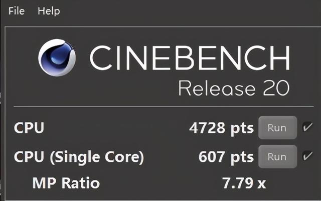 我们手动对其超频到了全核心4.7GHz,可以看到R20的多线程得分已经达到了4728分,但由于在全核超频状态下,单核频率最高也为4.7GHz,所以单线程得分和之前默认状态下的得分基本一致,只有607分。