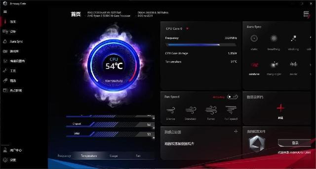 从华硕奥创智控中心中可以看到,主板传感器报告的VRM温度为53℃左右。从热成像图显示结果来看,VRM区裸露部分的最高温度仅为54℃左右,VRM散热装甲的表面温度仅为50℃左右,超强的20组供电和硕大的散热装甲在温度方面的表现确实值得称道。