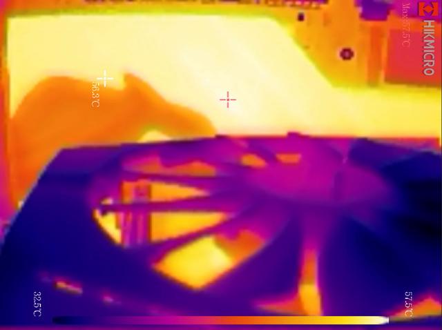 主板芯片组部分,奥创智控中心显示的主板传感器报告的Chipset温度为62℃,热像仪显示的散热片表面温度为57.5℃。即使没有主动散热的风扇,ROG C8E芯片组部分的温度也无需玩家们担心。