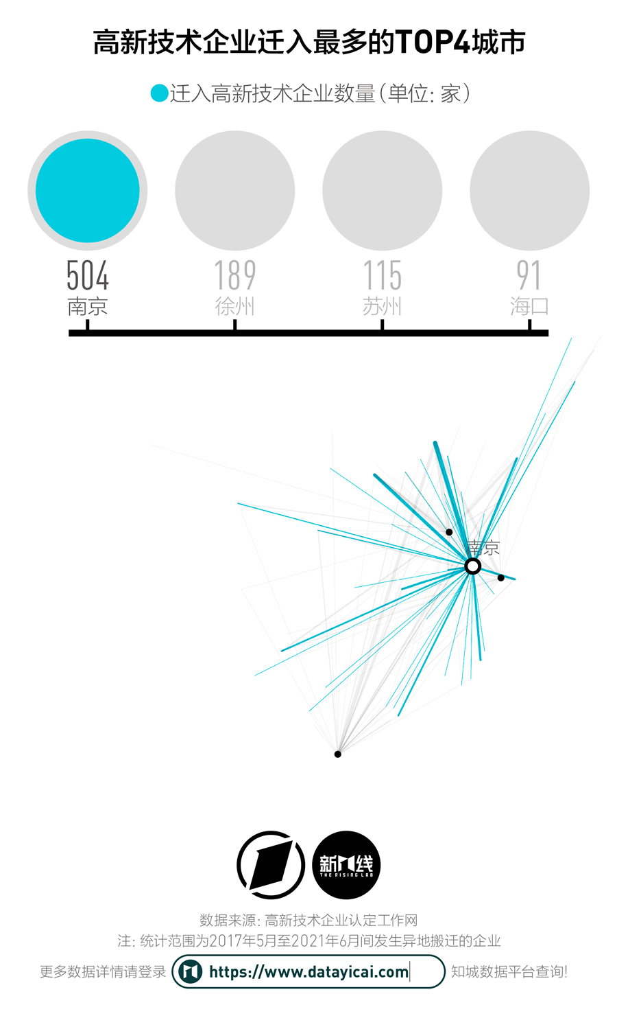 近期,新一线城市研究院从高新企业认定网获取了近年来有记录在案的高新技术企业搬迁事件,并对此进行了数据整理,并得出结果:南京、徐州、苏州、海口为高新技术企业迁入最多的4个城市,徐州高新技术迁入量为189个,位居全国第二。