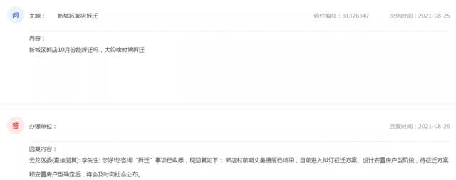 官方回复:郭店村前期丈量摸底已结束,目前进入拟订征迁方案、设计安置房户型阶段,待征迁方案和安置房户型确定后,将会及时向社会公布。