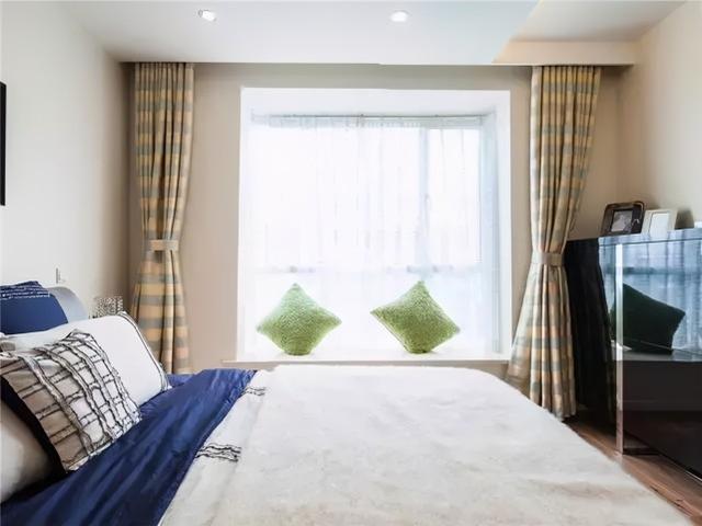主卧室,藏青和浅米色的搭配,让空间分外简洁充满时尚。