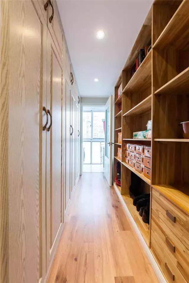 主卧室的衣帽间,空间不大,但两边却是满满的储物柜,完美满足家里收纳的需要。