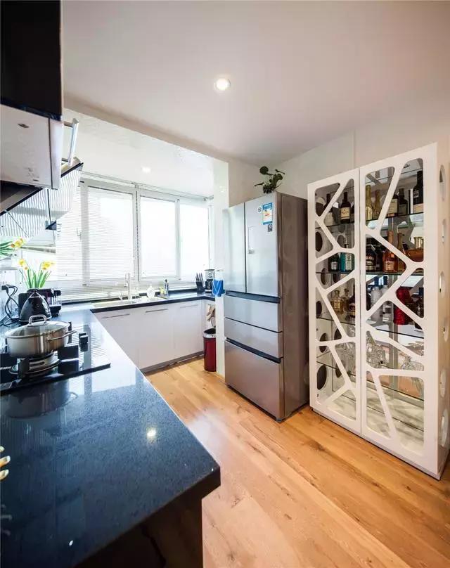 在厨房里,右边是冰箱和酒柜,前面是洗菜区。
