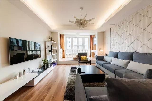 客厅正面的视角,尽头的阳台为了最大限度地利用空间,在装修时,将阳台改为榻榻米,瞬间就多了一间房,采光效果也是不错的。