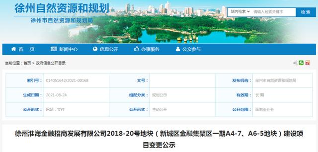 因建设单位申请,经徐州市自然资源和规划局研究批准,徐州淮海金融招商发展有限公司2018-20号地块(新城区金融集聚区一期A4-7、A6-5地块)建设项目规划进行了部分变更,