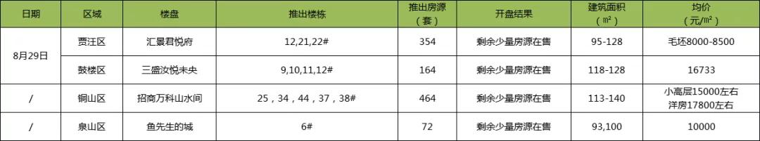 据不完全统计,徐州市上周共4家楼盘开盘,共计推出1054套房源,分别自贾汪区、鼓楼区、铜山区和泉山区。