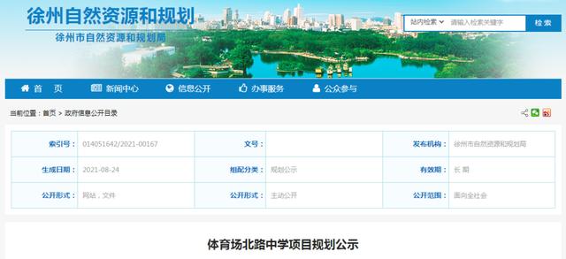 近日,徐州市自然资源和规划局网站公示了新城区体育场北路中学建设项目规划。
