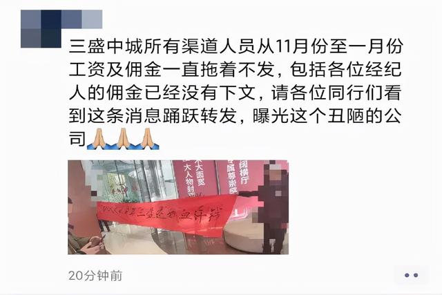 2021年1月28日,三盛中城项目因拖欠渠道佣金长达3个月,引发中介们维权。