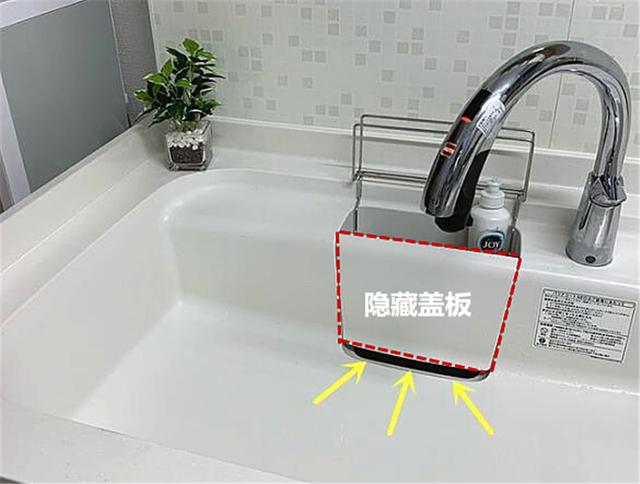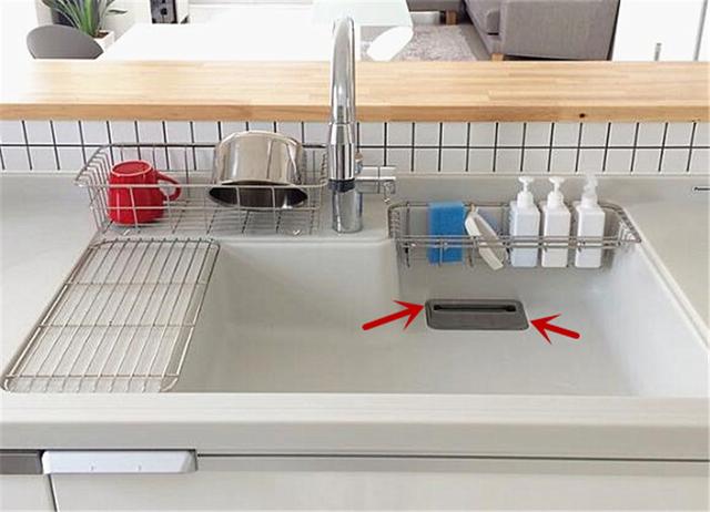这个地方和国内的水槽设计不一样,我们的水槽周围都需要一个辅助的置物架来收纳清洁用具,而日本人直接在水槽里做下沉式储物,大大减少了台面物品的放置,让表面看起来整洁清爽。
