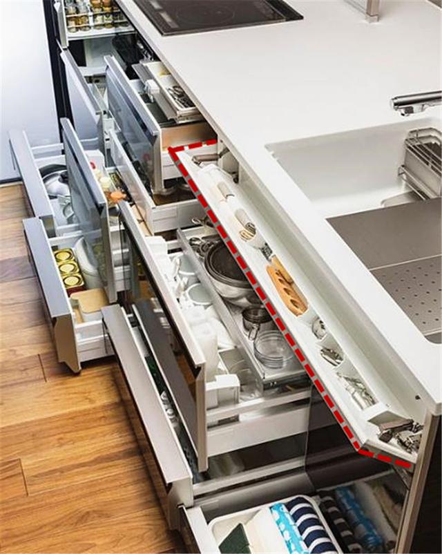 日本的柜子里有很多抽屉,而且有全开抽屉,这种抽屉的优点在于,可以把抽屉全部抽出来,没有死角。