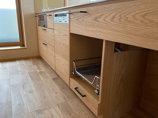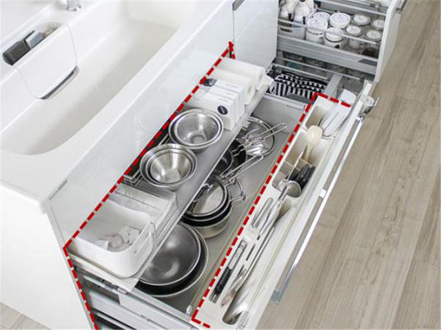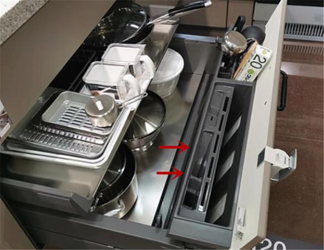 空置区域还可增加拉篮用作置物区,通风透气,放置锅或常用厨具,保持干燥、洁净。