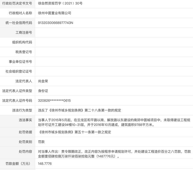 而6年后的2021年8月被徐州市自然资源和规划局责令限期改正,改正内容为按程序申请规划许可,并处建设工程造价百分之八罚款,罚款金额壹佰肆拾捌万柒仟柒佰柒拾陆元整