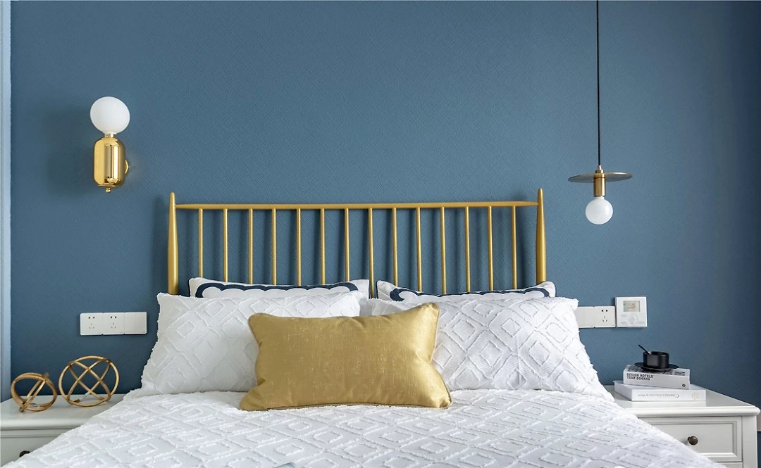 次卧以蓝灰色为主调,金属色及少女粉的置入,平衡了空间视觉呈现效果。