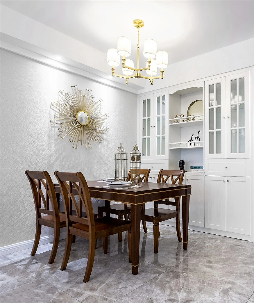 餐厅选用深色木质餐桌椅,让空间多了一份沉稳的感觉。金色吊灯与立体感十足的墙饰,提升空间质感与精致度。