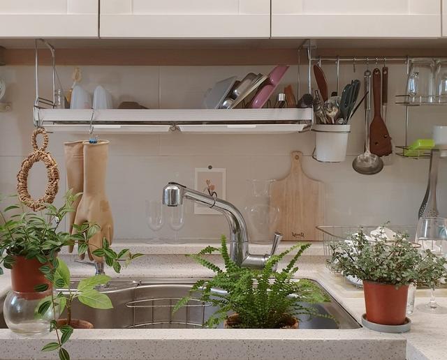 吊柜子下面的空间装上悬挂置物架,碗具、餐具,放在上面可以直接排空用用。桌面空间因此不够宽裕,但动脑筋该充分利用起来,也照样保持干净整洁。