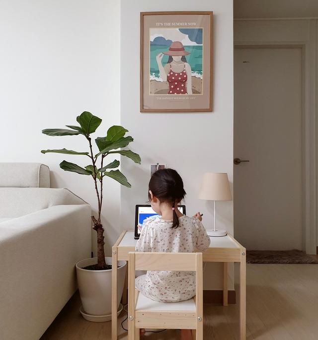 紧挨着沙发的位置,与其空闲,不如利用它,给孩子放个小书桌,营造一个小的学习区。