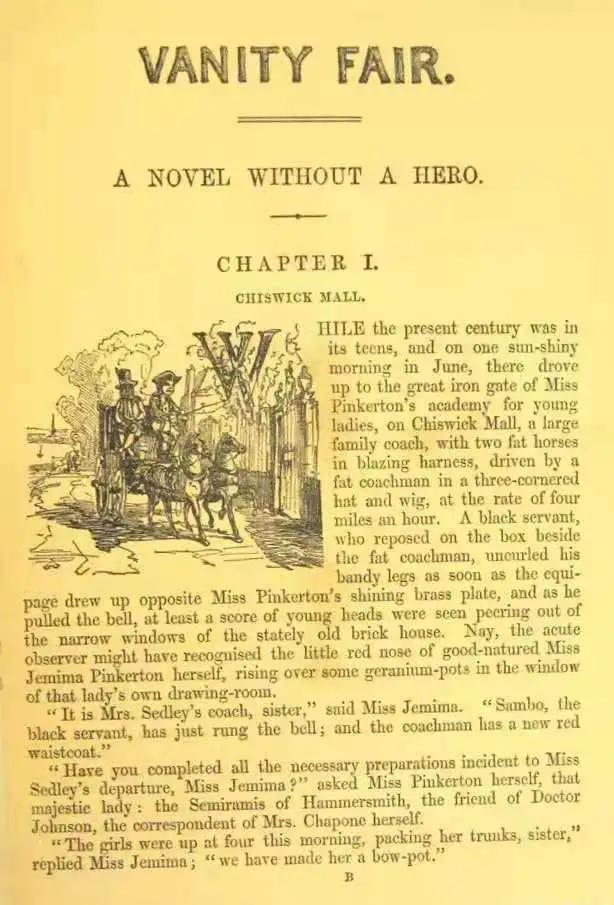 《名利场》这部小说正是一个恰当的例子。英国在十九世纪前期成了强大的工业国,扩大了殖民地,加速了资本主义的发展。当时讲究的是放任主义和自由竞,富者愈富,贫者愈贫,社会分裂成贫富悬殊的两个阶层。新兴资产阶级靠金钱的势力,渐渐挨近贵族的边缘;无产阶级越来越穷,困苦不堪。萨克雷说,看到穷人的生活,会对慈悲的上天发生怀疑。他对他们有深切的同情,而且觉得描写矿工和工厂劳工的生活可以唤起普遍的注意,这是个伟大的、还没有开垦的领域,可是他认为一定要在这个环境里生长的人才描写得好。他希望工人队伍里出个把像狄更斯那样的天才,把他们的工作、娱乐、感情、兴趣,以及个人和集体的生活细细描写。他自己限于出身和环境,没有做这番尝试。《名利场》里附带写到大贵族,但是重心只在富商大贾、小贵族地主以及中小商人——马克思所谓“中等阶级的每个阶层”。这是萨克雷所熟悉的阶级。