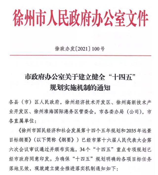 近日,徐州市人民政府官网发布了《建立健全“十四五”规划实施机制的通知》。