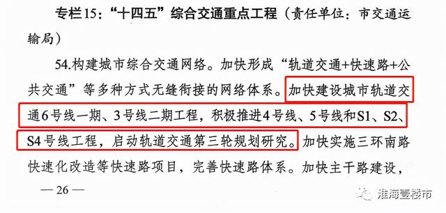 加快建设城市轨道交通6号线一期、3号线二期工程,积极推进4号线、5号线和S1、S2、S4号线工程,启动轨道交通第三轮规划研究