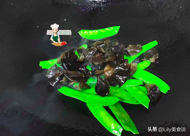 3、热锅凉油,将荷兰豆、木耳下锅煸炒,炒至断生。