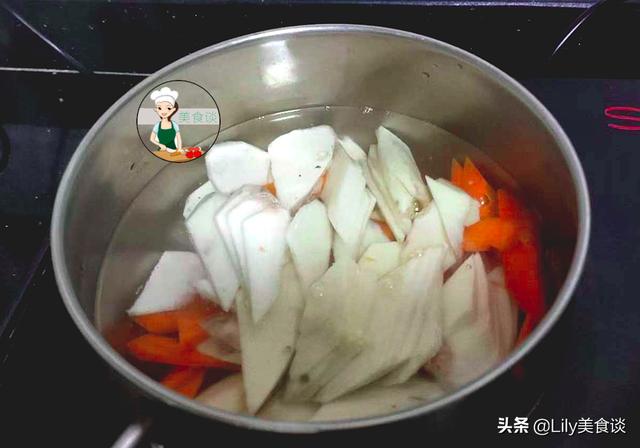2、锅里加入适量的清水,将山药、胡萝卜下锅焯水煮沸,断生后捞起沥干水分待用。