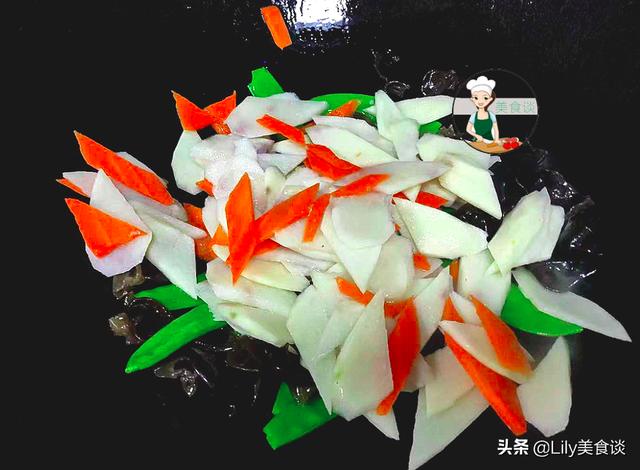 1、木耳提前泡发洗净待用、山药洗净切片待用、胡萝卜洗净切片待用。荷兰豆撕掉老筋洗净待用。