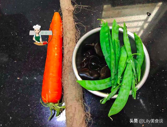 准备食材:山药适量、荷兰豆少许、胡萝卜少许、木耳适量。