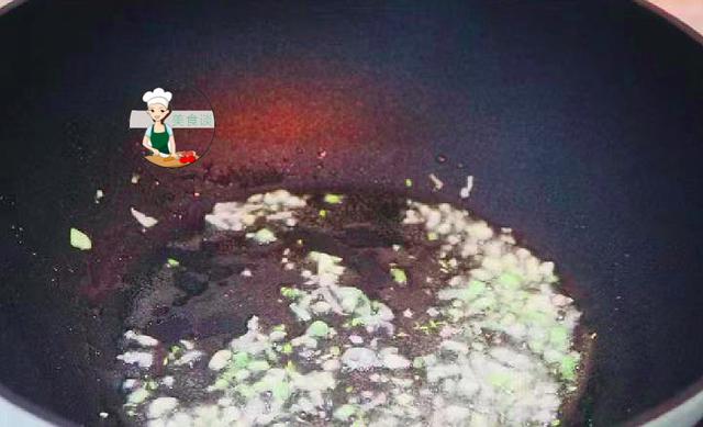 6、热锅凉油,下入大蒜和葱粒下锅煸炒出香味来。