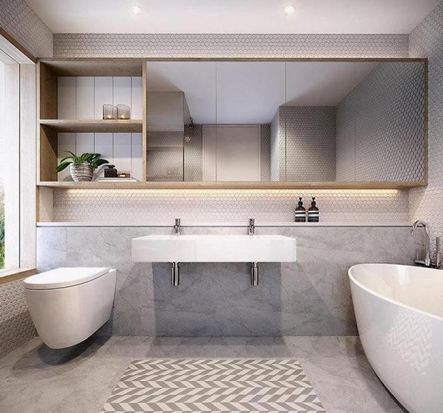 也有这样的三段式分区目前也是超级流行的卫生间分割方式,马桶和浴缸分别放置在洗漱台的两边,墙的上半部打空,下面可作为台面放东西,上面可做成镜柜,这样使用面积多出很多!